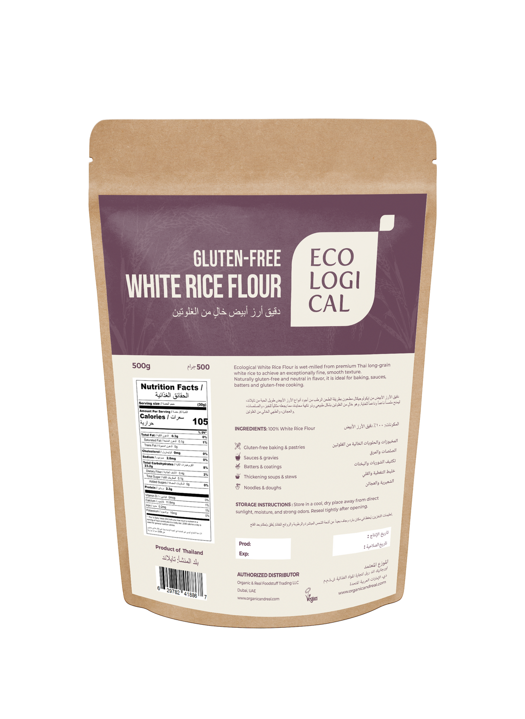 Ecological Gluten-Free White Rice Flour is a wet-milled, super-fine flour made from premium Thai long-grain white rice. Naturally smooth in texture and neutral in flavor, it is ideal for a wide variety of gluten-free cooking and baking applications.