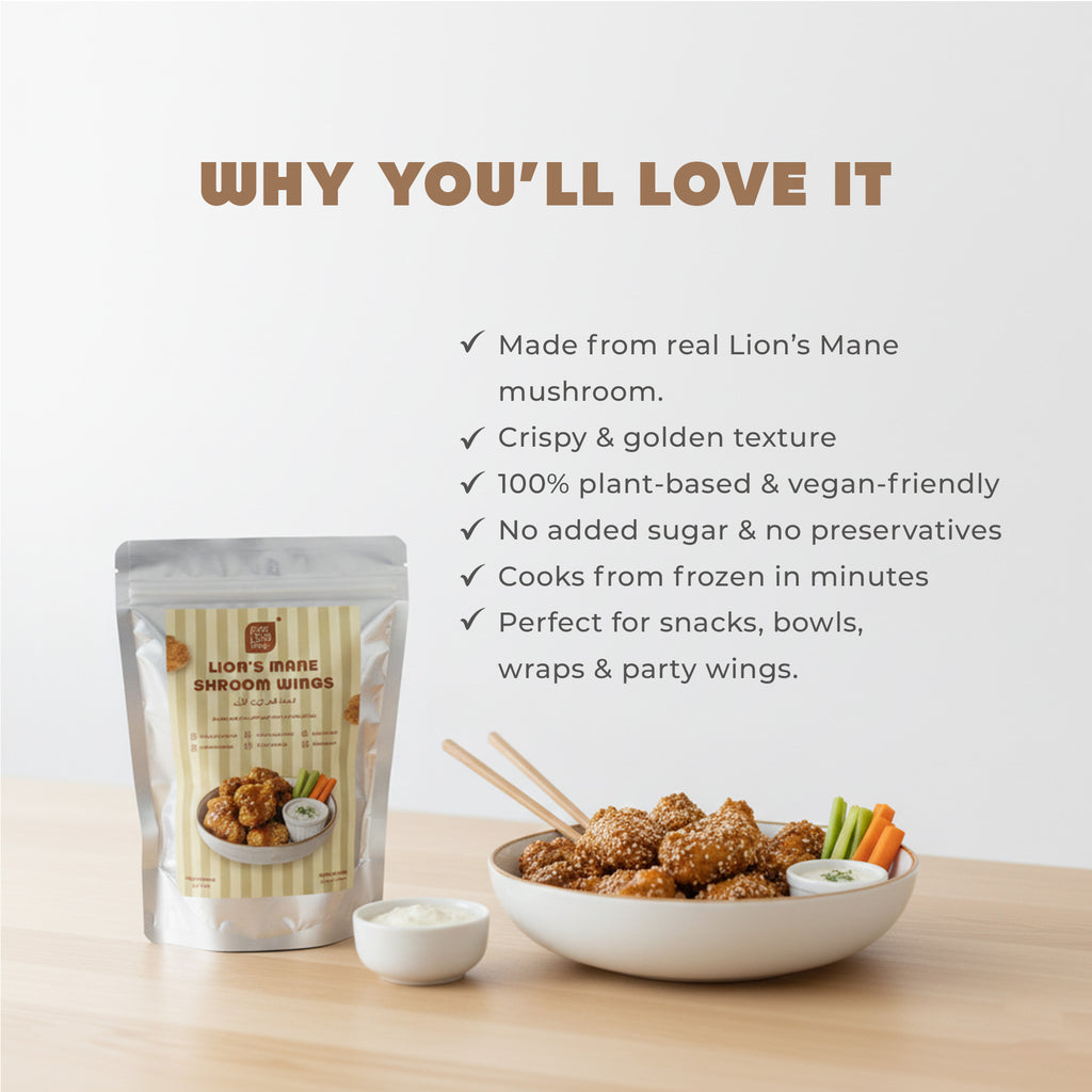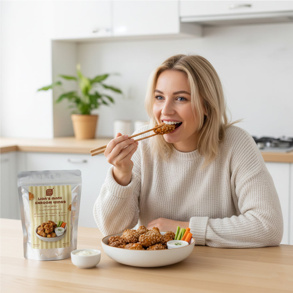 Ecological Lion’s Mane Mushroom Wings are handcrafted, crispy plant-based wings made from premium Lion’s Mane mushrooms, celebrated for their naturally meaty, fibrous texture. Each piece cooks straight from frozen into a golden, flavour-rich bite that delivers the indulgent feel of wings — without the meat.