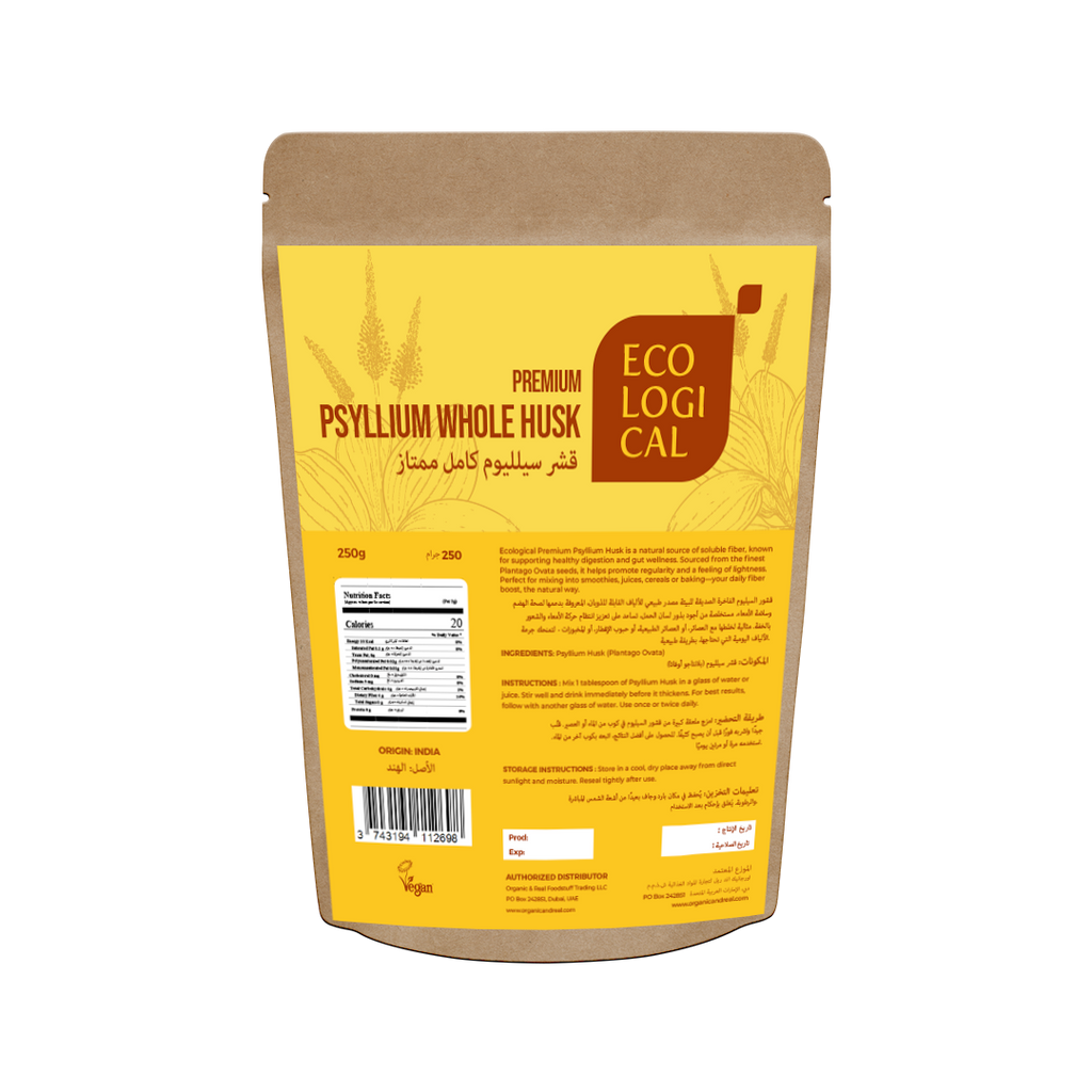 Introducing our premium ECOLOGICAL Organic Psyllium Husk Whole, 250g — a 100% natural, high-fiber superfood designed to support digestive wellness and overall gut health. Sourced from the finest Plantago ovata seeds, this soluble fiber powerhouse helps promote healthy digestion, regularity, and a light, balanced feeling throughout the day.